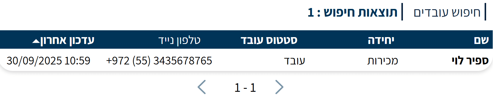לאחר ביצוע החיפוש, תוצג רשימת עובדים תואמת לקריטריונים.