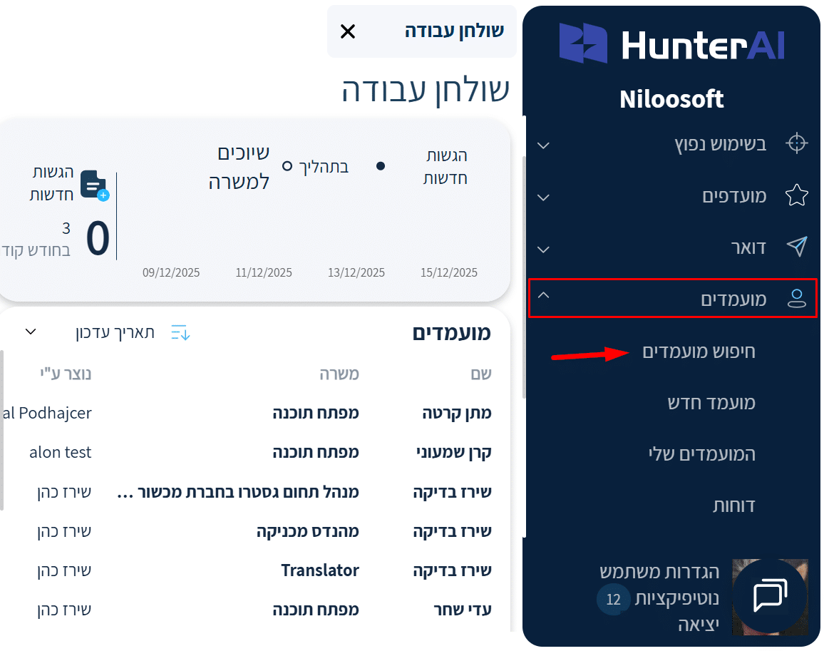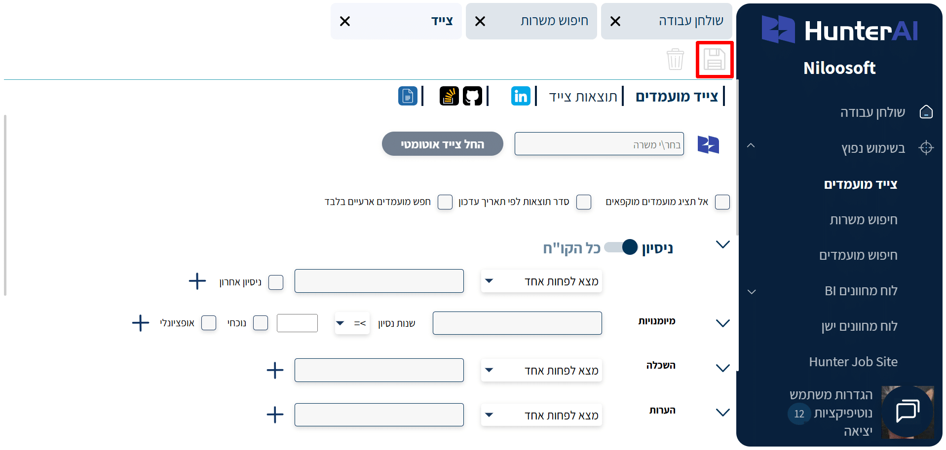 לדוגמה: יש צורך להיכנס ללשונית “מועמדים” כדי לחפש מועמדים, ללשונית “משרות” כדי לחפש משרות, וכן הלאה.