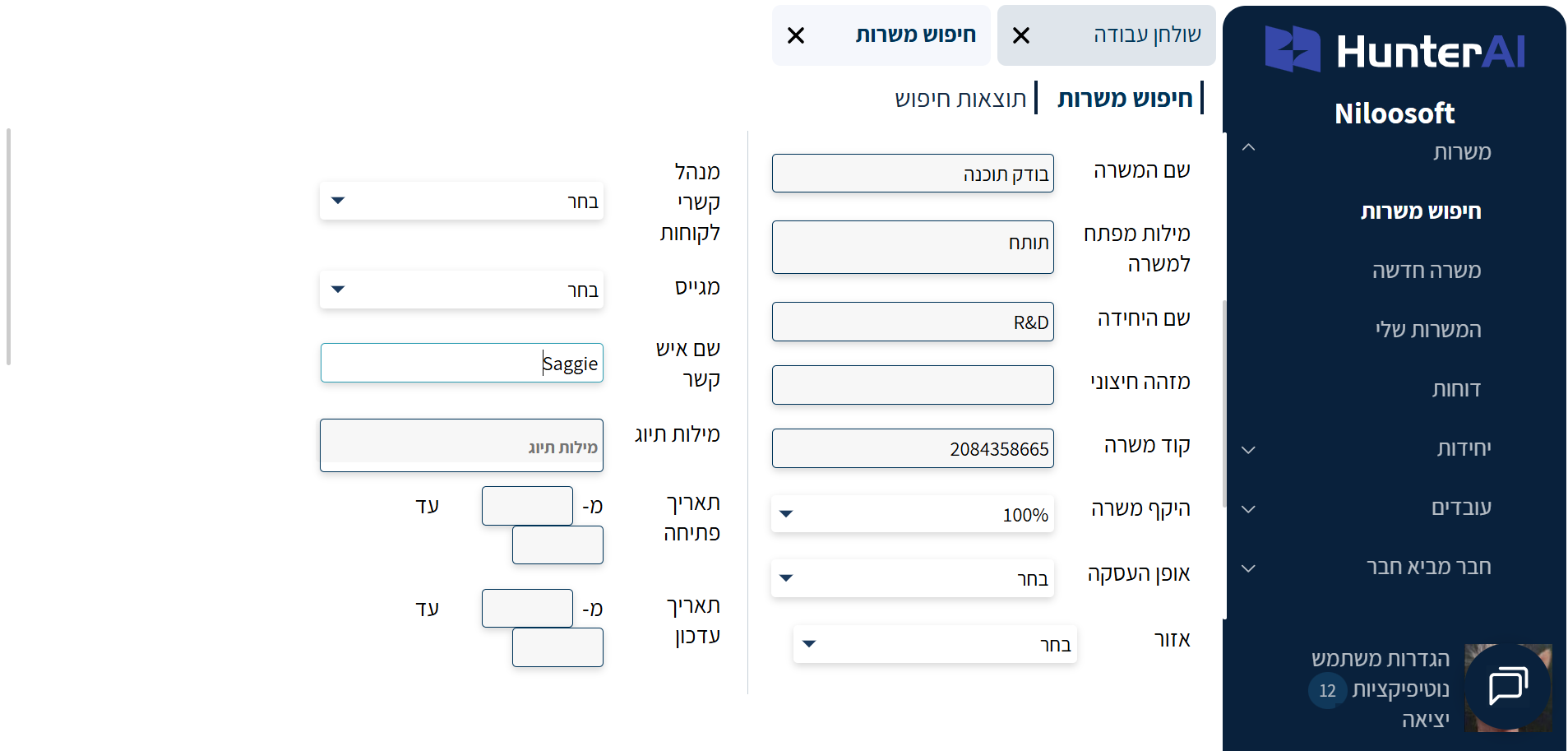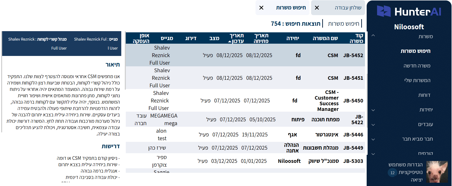 כעת, בלחיצה על כל אחת מהתוצאות ניתן להיכנס לדף פרטי הרשומה הנבחרת – לדוגמה, אם לחצתם על משרה, תעברו אוטומטית לדף הפרטים שלה שם תמצאו את כל המידע המשויך לאותה משרה, כולל מועמדים רלוונטיים, פעילויות אחרונות, מסמכים ופרטים נוספים, לניהול מלא מתוך דף אחד.