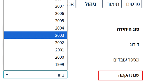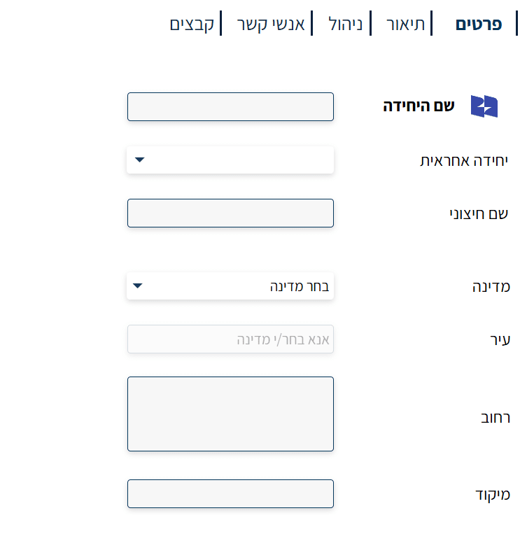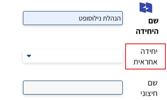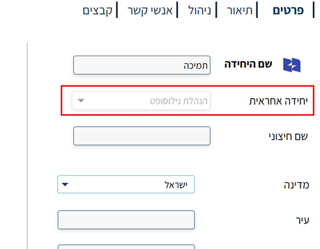 שימו לב: מאחר שזו יחידה בדרג העליון, אין צורך למלא שדה “יחידה אחראית”, משום שאין מעליה יחידה נוספת.