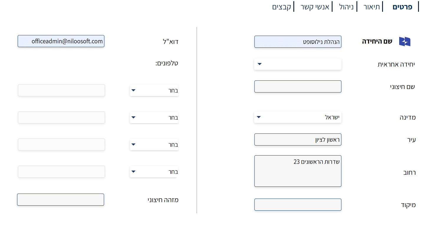 מלאו את הפרטים של היחידה – לדוגמה: הנהלת נילוסופט.