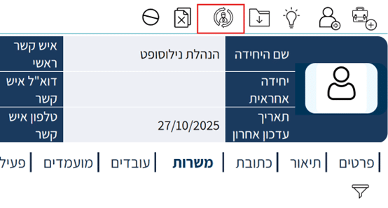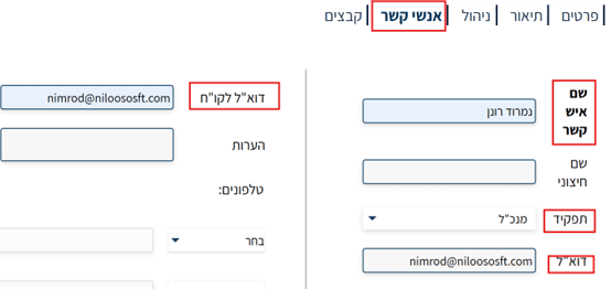 בעמוד “אנשי קשר” הזינו את פרטי איש הקשר של היחידה – לדוגמה: מנכ”ל החברה.