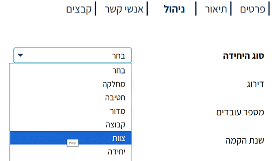 - נבחר את סוג היחידה (במקרה שלנו זה צוות ניהול נילוסופט)