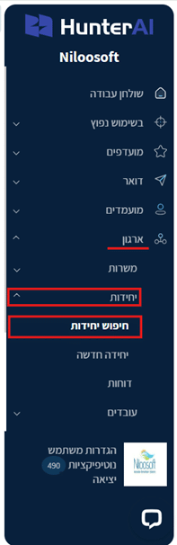 ניהול יחידות במערכת Hunter AI מספק לארגון תמונה מלאה ומסודרת של המבנה הארגוני, המשרות והעובדים.
