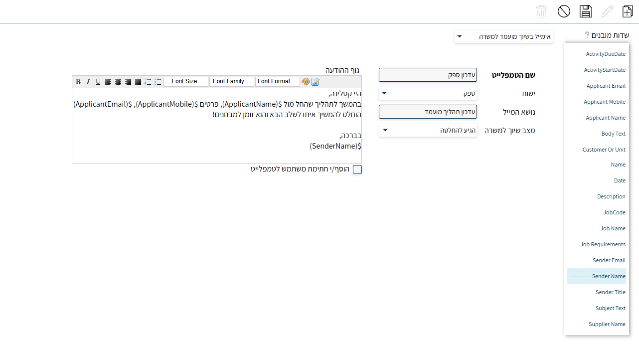 טמפלייטים במערכת מאפשרים ליצור תבניות קבועות למיילים ולהודעות לאורך תהליך הגיוס.