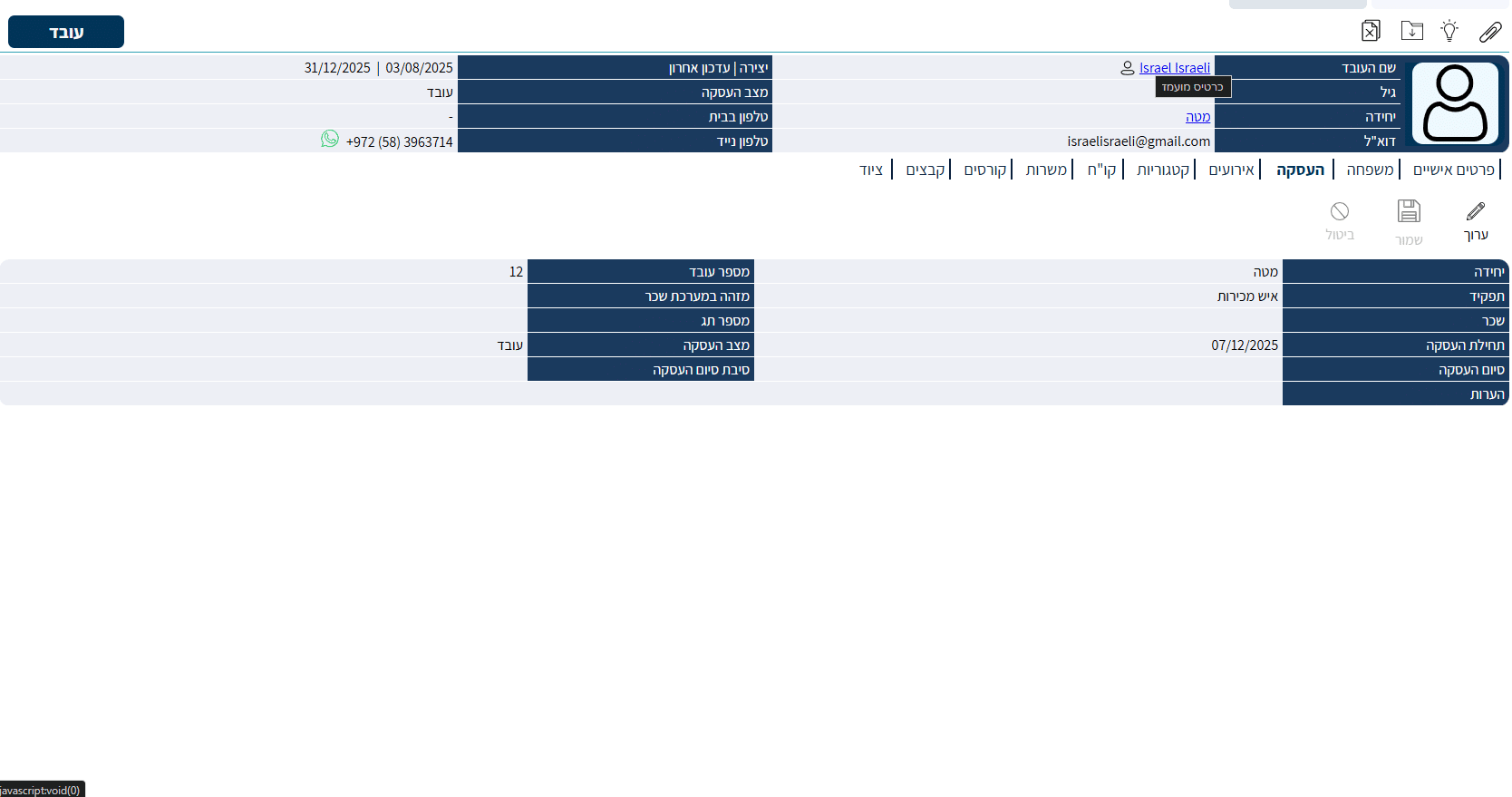 כאשר המערכת מזהה שעובד קיים גם כרטיס מועמד, נוצר קישור ישיר (לא רטרואקטיבי) שמאפשר לצפות בהיסטוריית המועמדות מתוך כרטיס העובד.