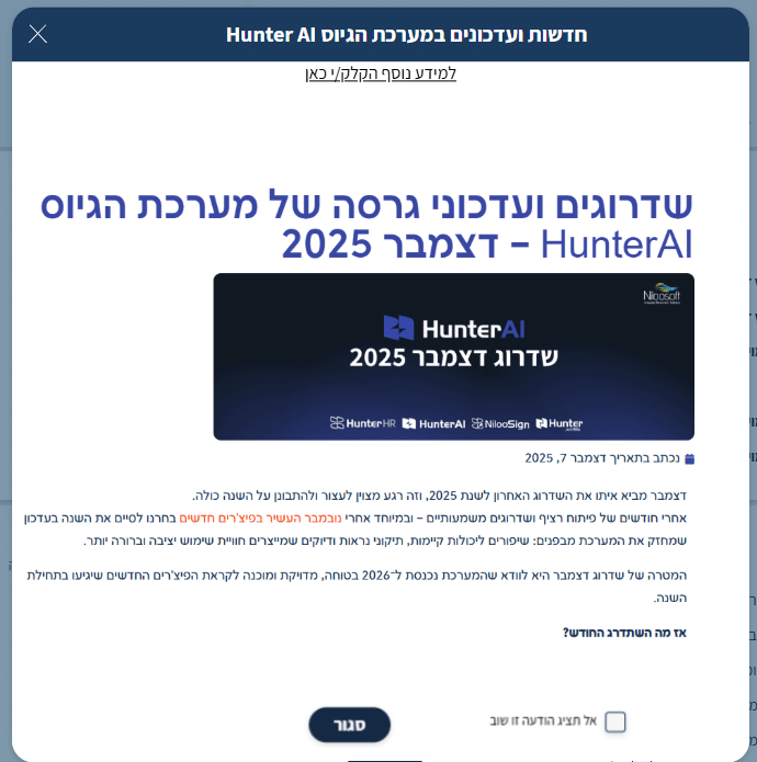 שדרוגים ועדכוני גרסה של מערכת הגיוס HunterAI – ינואר 2026