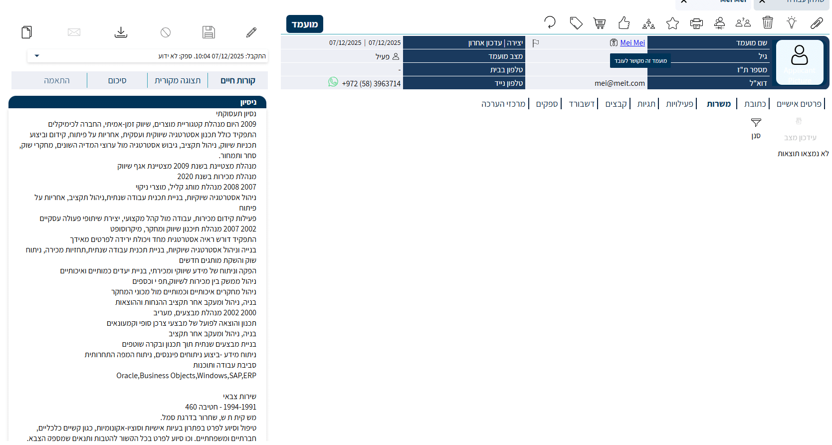 שמפשט את העבודה מעכשיו, כשעובד קיים מגיש מועמדות, המערכת מזהה את הפרטים שלו (ת”ז, נייד, אימייל או שם) ומבצעת קישור אוטומטי בין כרטיס המועמד לכרטיס העובד.