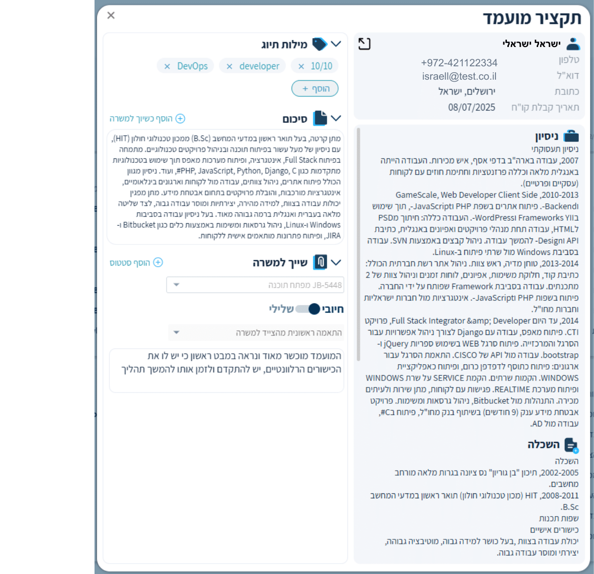 התקציר עבר התאמות נראות והרחבה משמעותית ביכולות: כעת ניתן לפתוח מספר טאבים במקביל בצד שמאל, ולעבור בין מועמדים בצורה הרבה יותר זורמת. הסביבה האידיאלית לעבודת סינון ממוקדת.