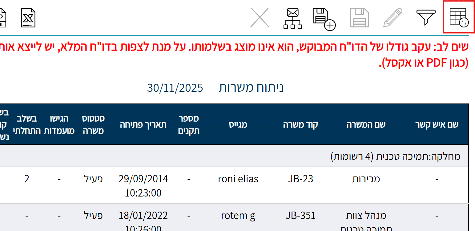 לאחר הגדרת מבנה הדוח והסינון, נלחץ על: