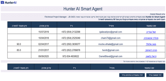 - שליטה מלאה מהאימייל: אפשר “לקפוץ” בלחיצה לתוך כרטיס המועמד, לדפדף לתוצאות הצייד או לראות מועמדים שטרם נסרקו – הכל בקליק.